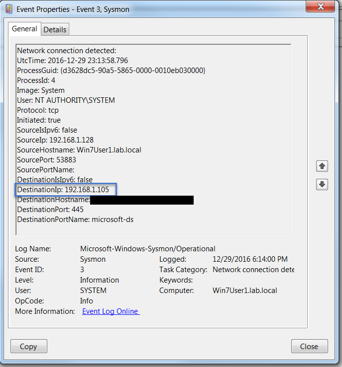 Finally, the script loops through these logs, and if it finds a destination port of 445 (SMB) and the destination IP is not our domain controller, then it writes a message out.