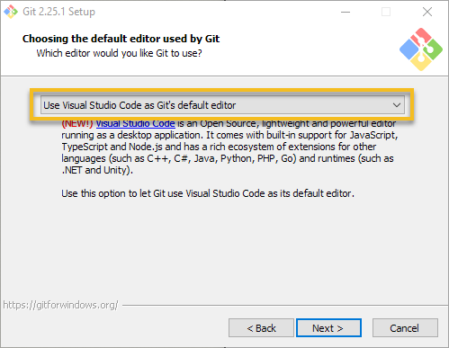 During the setup, you'll have the option to use VS Code as the default edit for git, I chose this option: