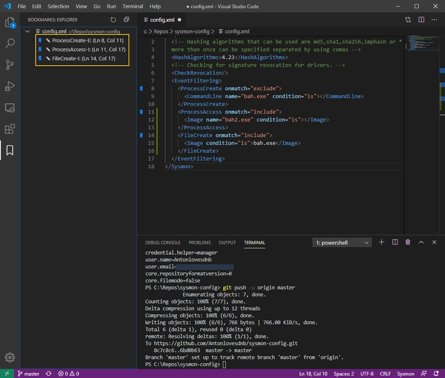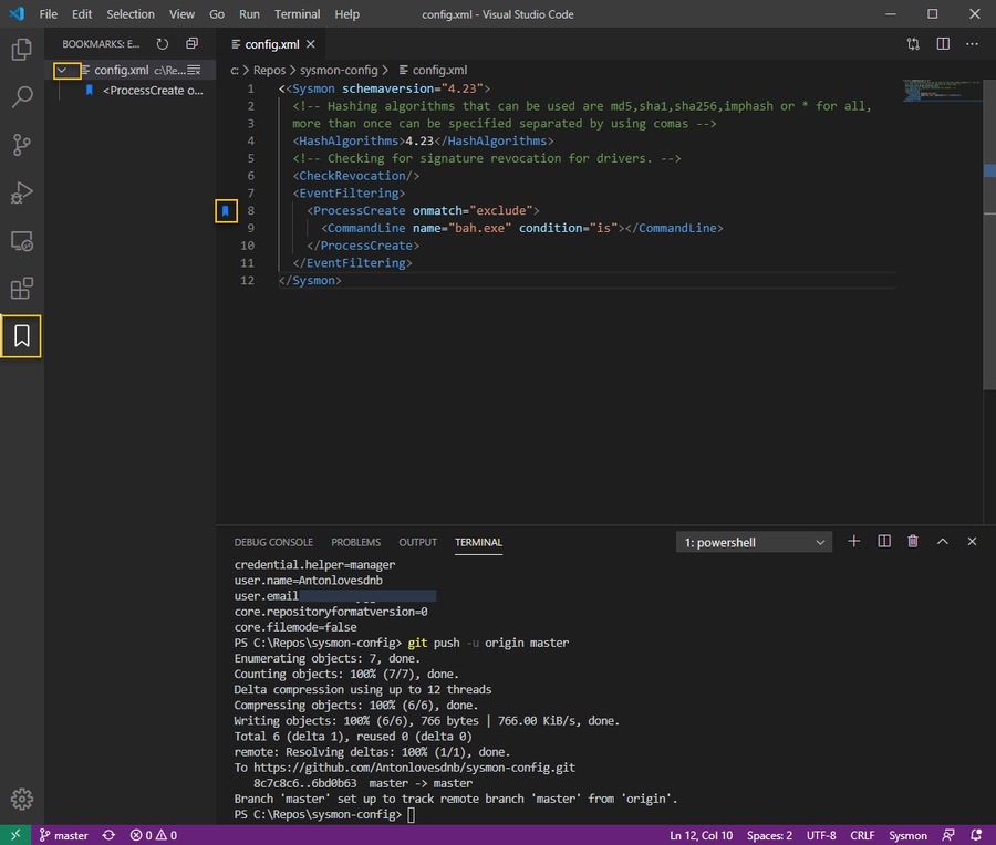 As a final step, use the Bookmarks add-on to configure bookmarks within your Sysmon config so you can follow along with the various sections in a large config file.