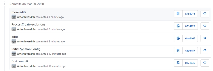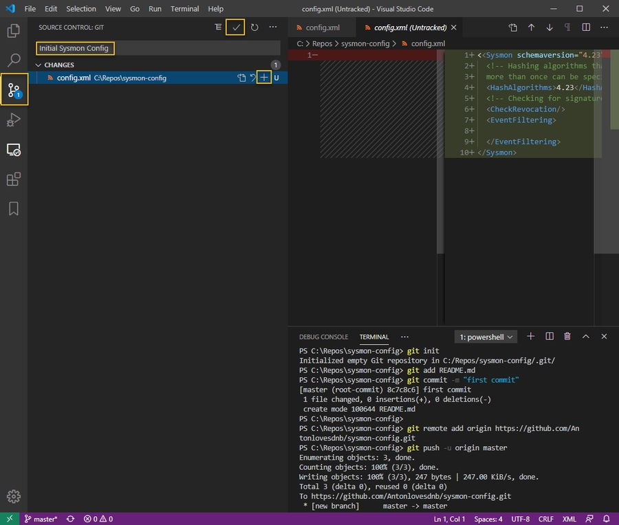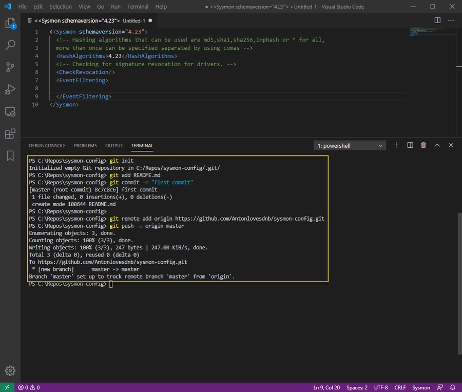 In my case, I had a private GitHub repo set up for my Sysmon config, so I want to set that repo up and then save my new blank Sysmon config file to it:
