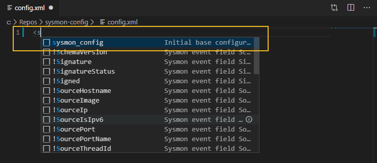 Now your Sysmon config is source controlled and resides in a feature-rich text editor with auto-complete unique to Sysmon's config syntax, nice!