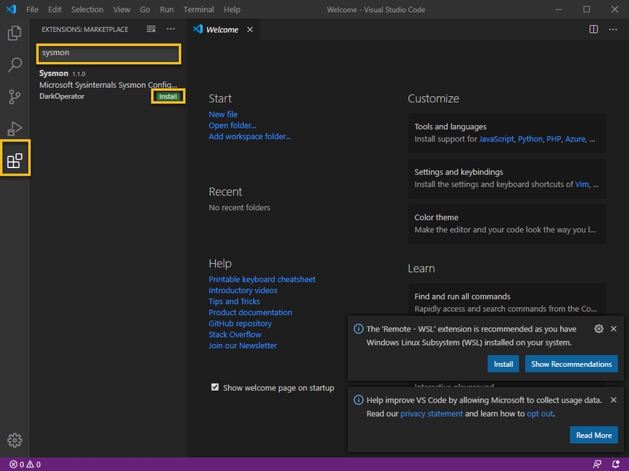 Navigate to the Extensions menu and search for and install the Sysmon extension: