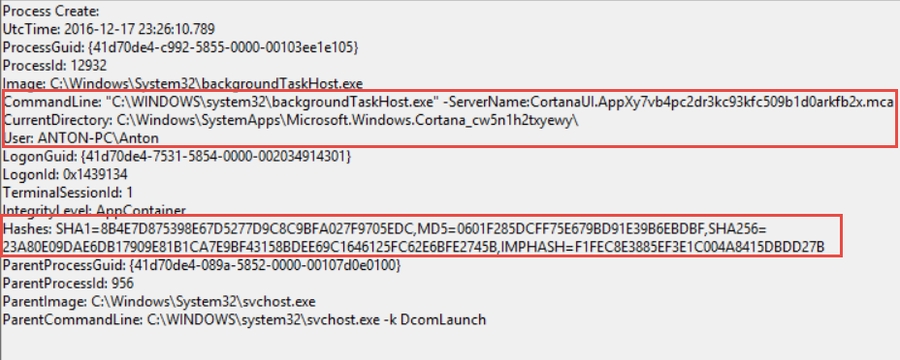 We only want to parse out the events that are highlighted in red (CommandLine, CurrentDirectory, User and Hashes).